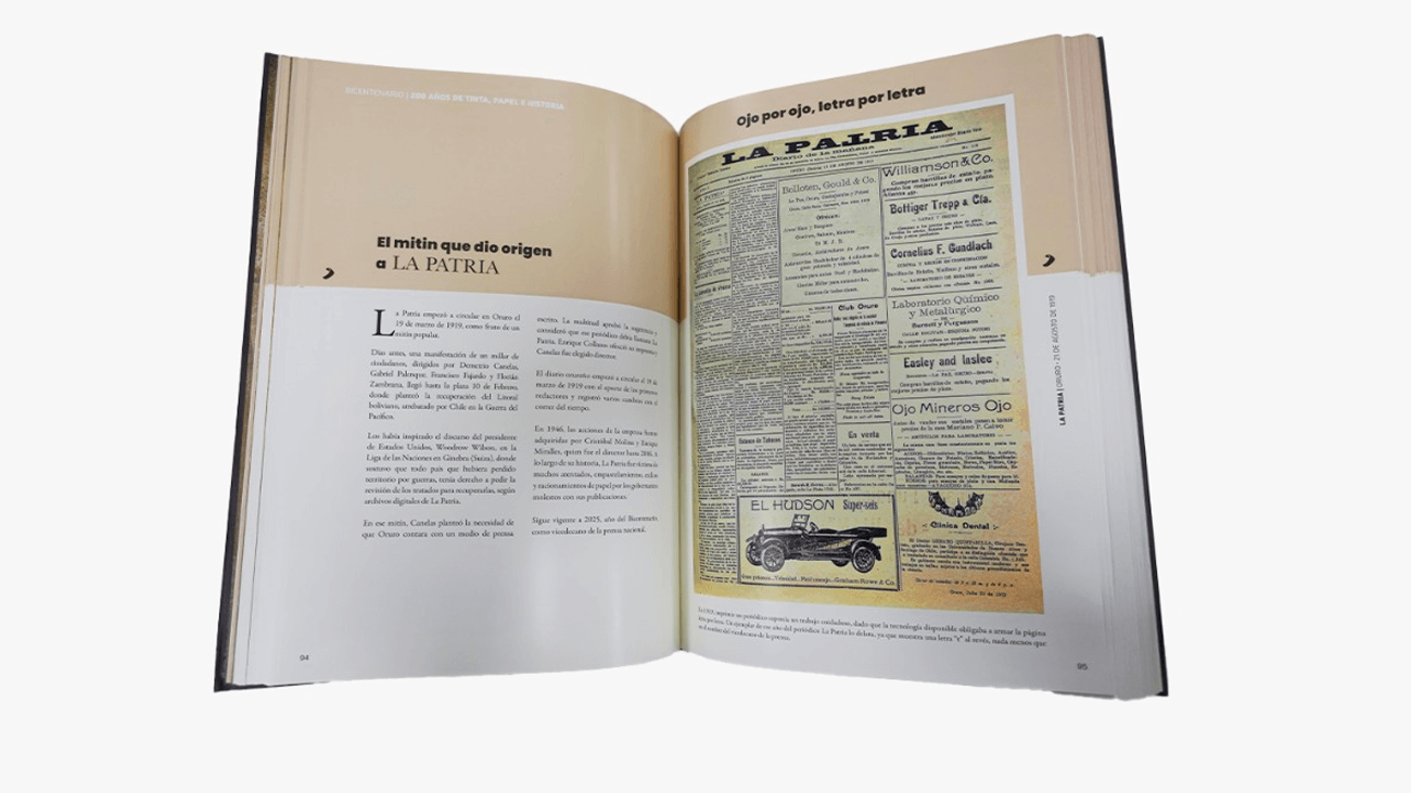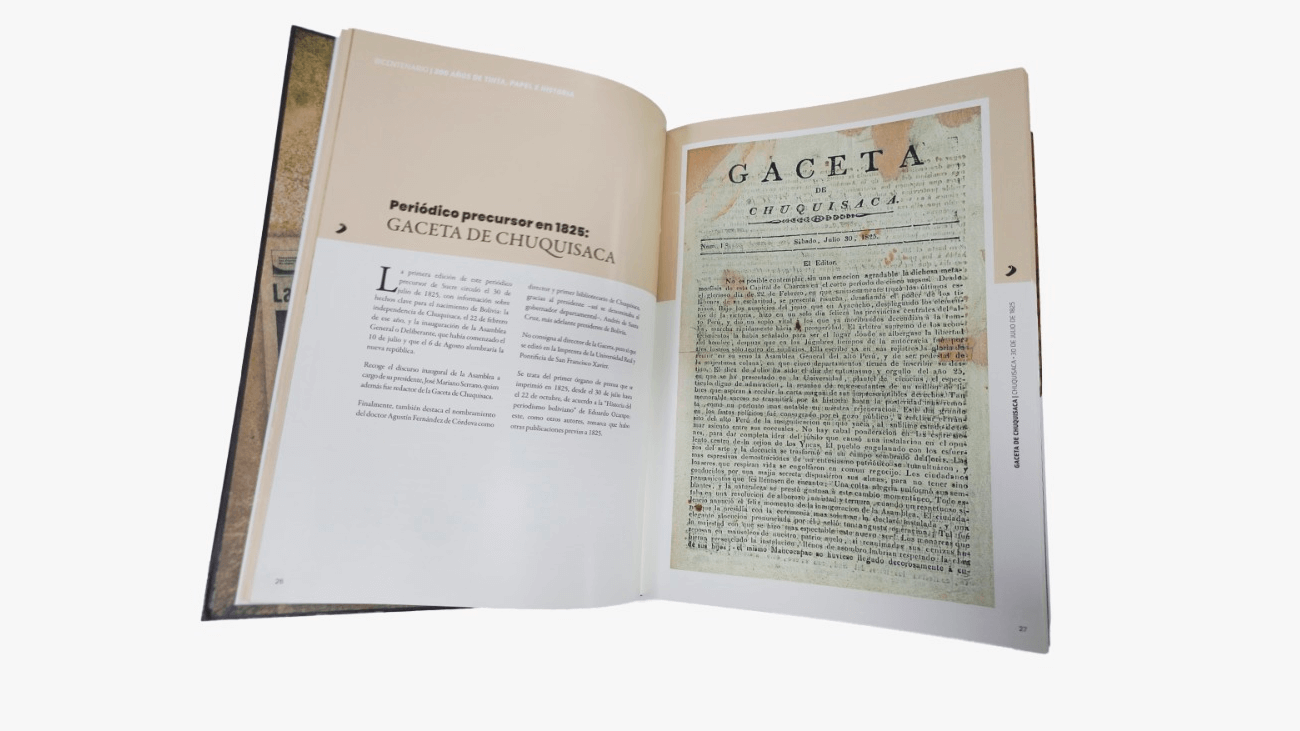 En el marco del Bicentenario de la Independencia de Bolivia, el Banco de Crédito de Bolivia (BCP) presentará este 4 de agosto en Sucre, “200 años de tinta, papel e historia”, un libro que reúne portadas representativas de los periódicos bolivianos a lo largo de dos siglos.