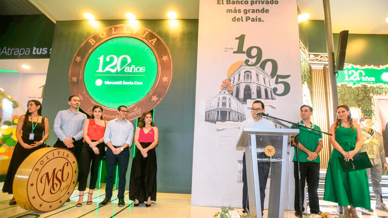El eje central del stand será la celebración del aniversario del BMSC. Los 120 años del Banco Mercantil Santa Cruz son un testimonio de excelencia, solidez, confianza y compromiso con Bolivia. Desde su fundación en 1905 por Simón I. Patiño, que creó el banco con el claro objetivo de fortalecer el desarrollo financiero del país, el BMSC ha acompañado el pulso cambiante de Bolivia.